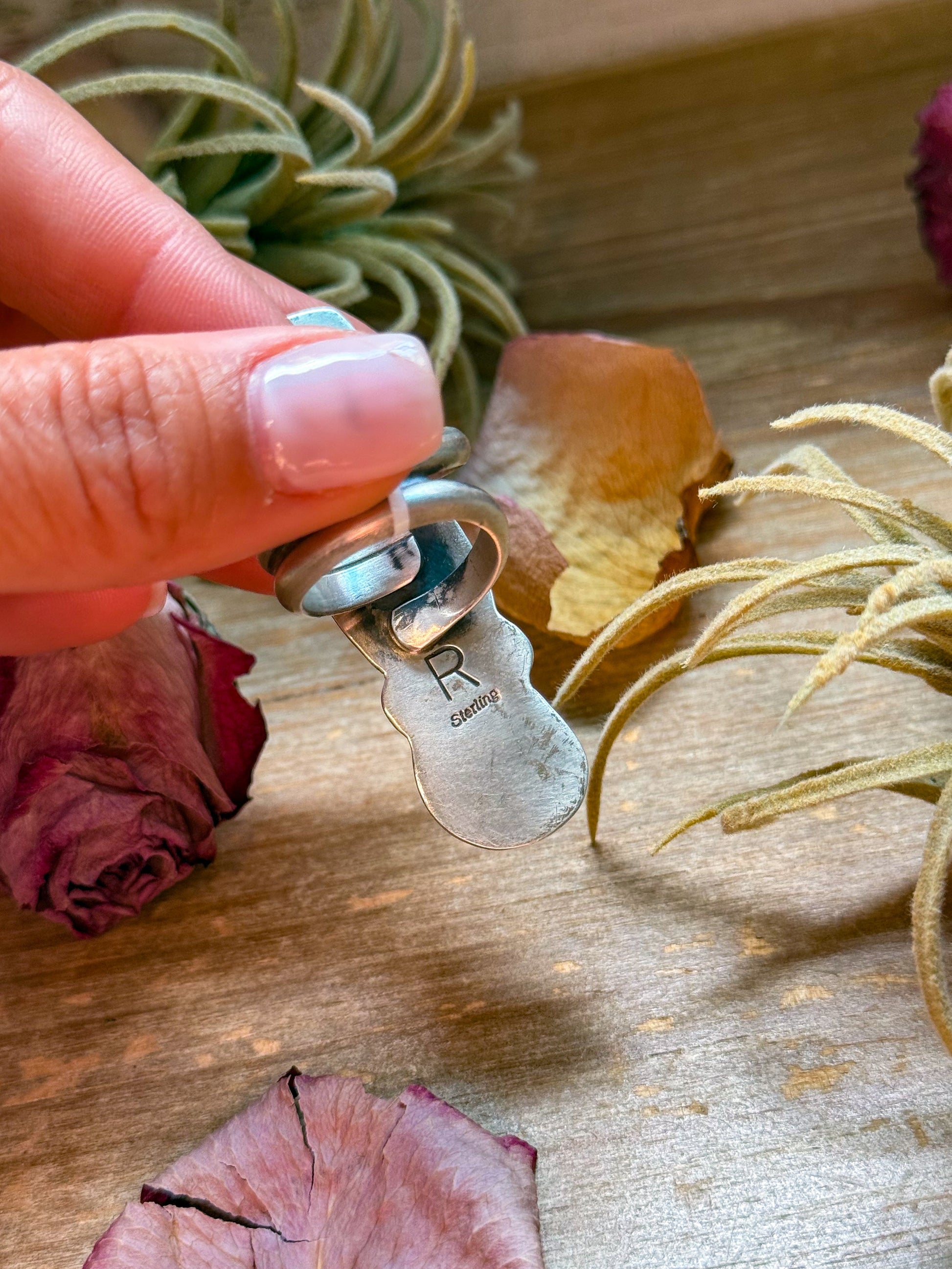 Stamped with the artist’s “R” hallmark and STERLING, this ring is fully adjustable, allowing a comfortable fit for multiple sizes. The triple-stone layout makes a bold statement — elegant, earthy, and timeless all at once.