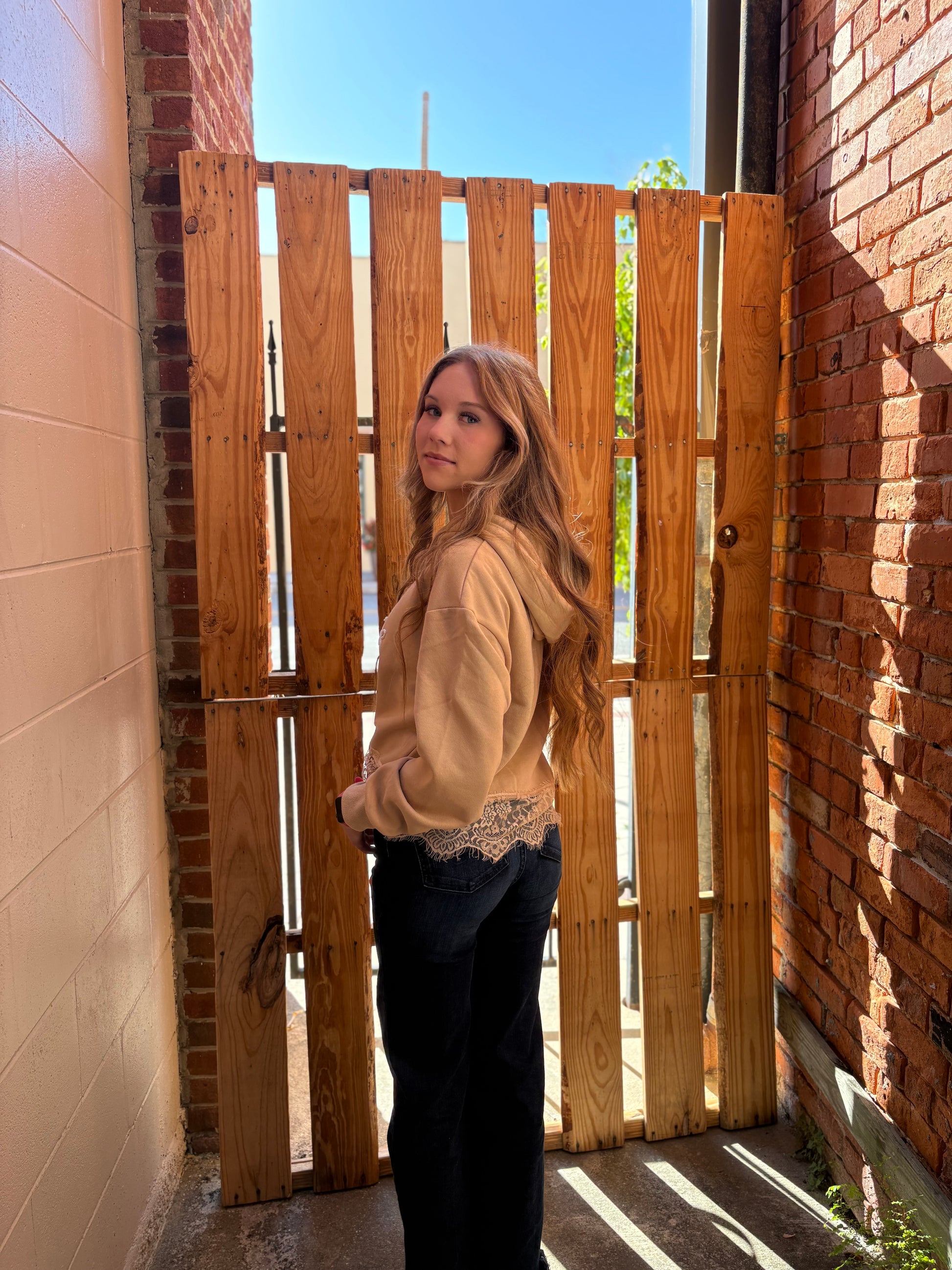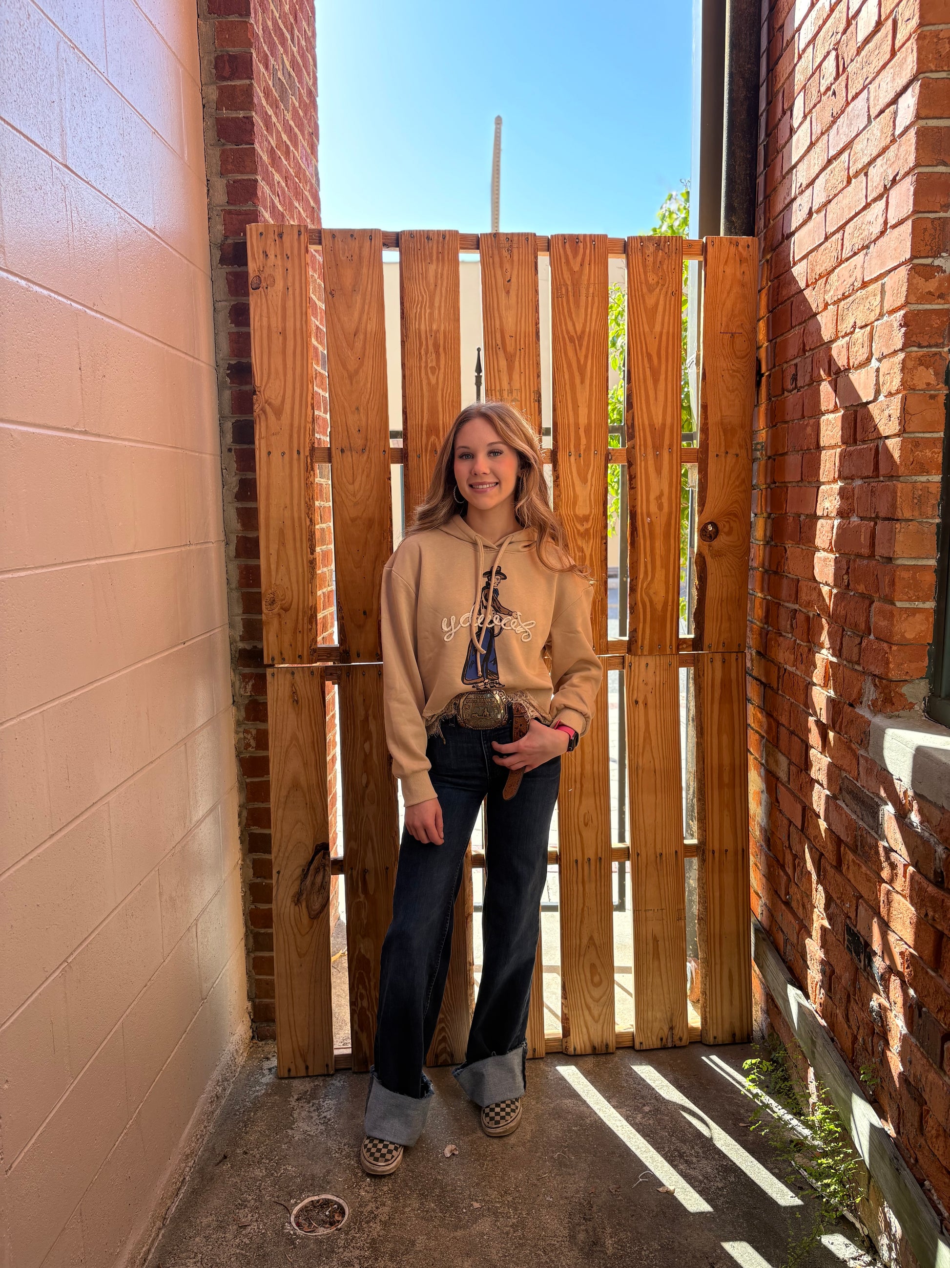 Finished with a lace-trimmed bottom hem for a dressier touch and a bold cowboy graphic up front, the real showstopper is the backwards “HOWDY” stitched in our signature rope embroidery—a subtle nod to classic Western detail with a modern twist. Style it with comfy denim, boots, and your favorite jewelzzz for an effortlessly cool, elevated hoodie moment.