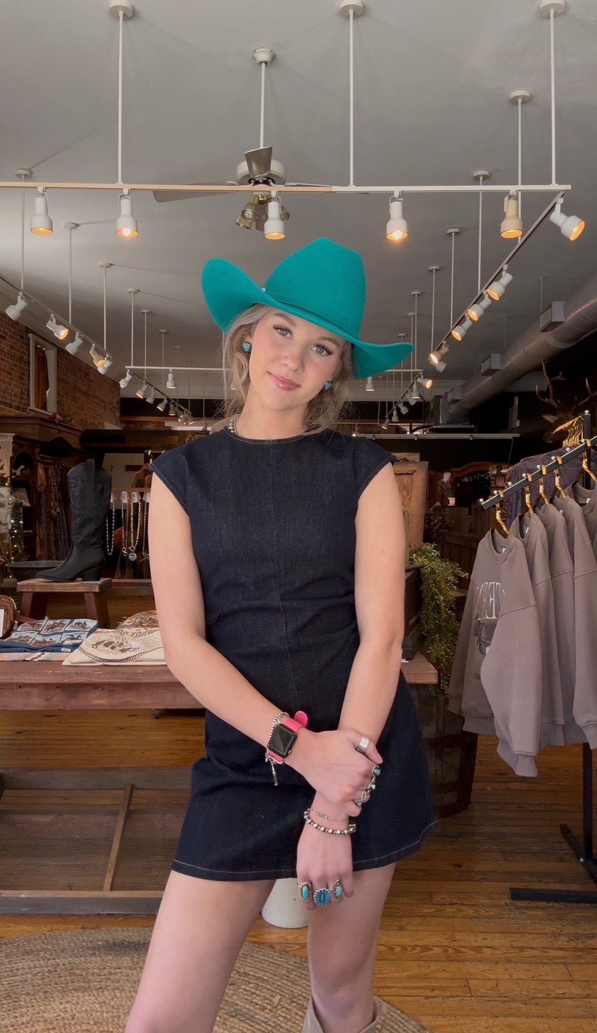 Turn heads from sundown to last call in the Blue Spur Denim Dress. Crafted from a soft, stretch-blend denim, this fitted mini hugs in all the right places with cinched stitching at the hips for a flattering, hourglass shape. The high neckline and sleeveless cut give it a modern, edgy twist while the back zipper makes slipping it on a breeze. Perfect for boots, belts, and a little bit of whiskey-fueled confidence. 🤠