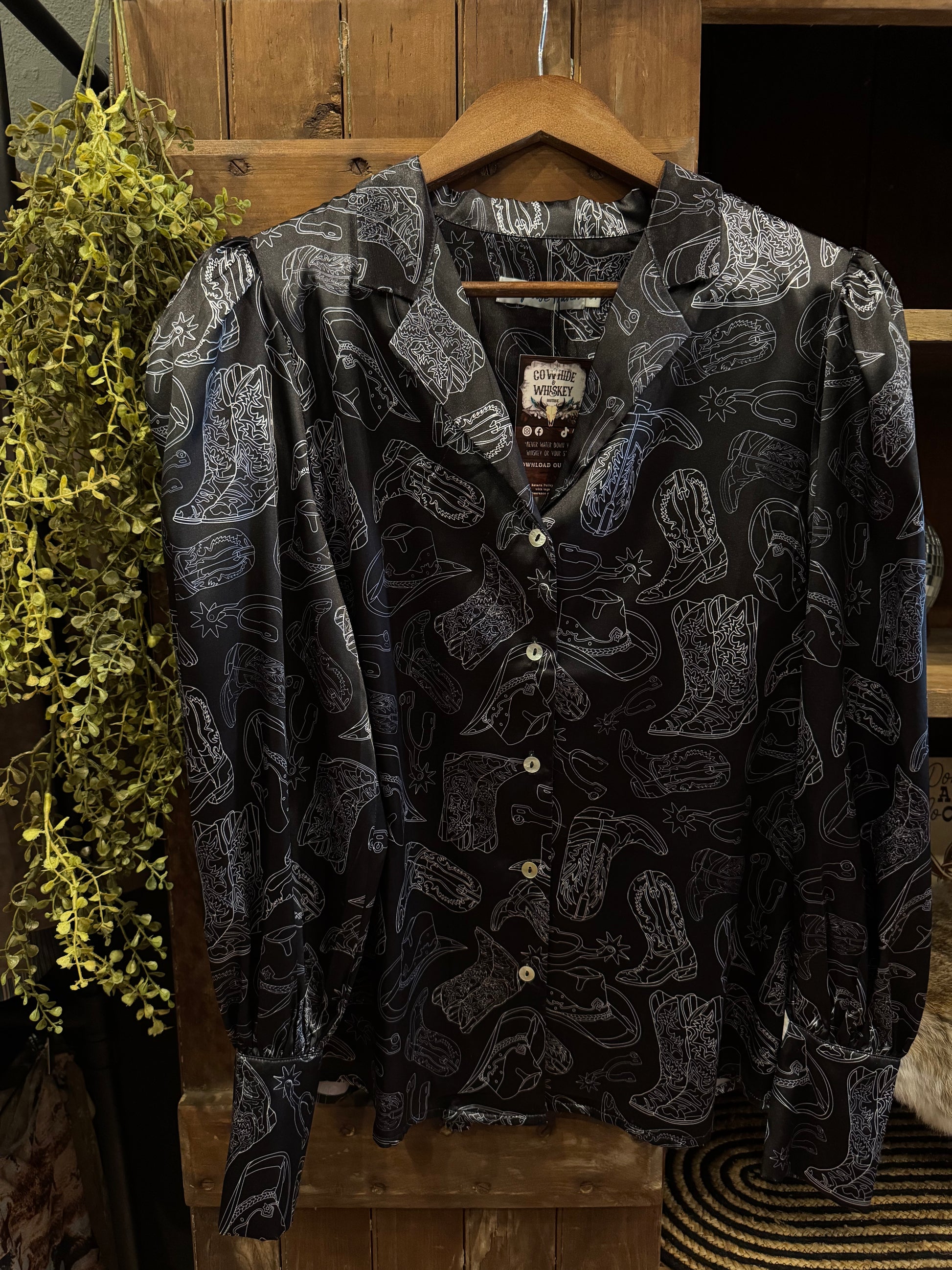 Western meets satin sophistication in the Boots After Dark Top. This black satin button-up features playful white boot prints throughout, giving it a fun, standout twist on a classic silhouette. The cuffed puff sleeves add a touch of femininity, while the smooth satin finish brings just the right amount of shine. Designed with a hint of stretch for all-day comfort and movement.