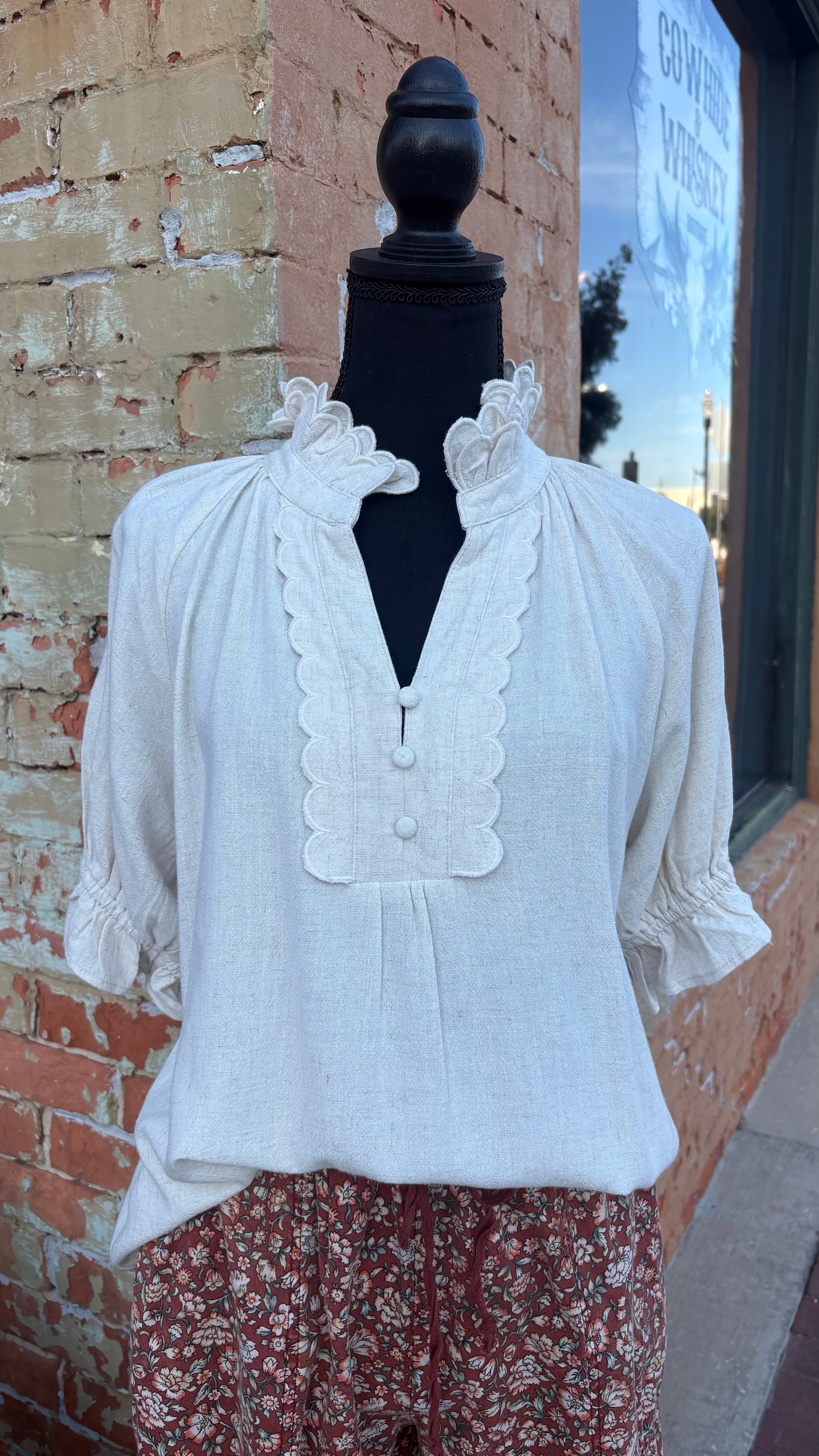 Soft, timeless, and effortlessly romantic, the Cottage Morning Scallop Top is perfect for layered autumn looks or wearing on its own. Crafted from 100% cotton, this blouse features a delicate scalloped button-down collar and puff cuff sleeves, adding subtle vintage charm to a relaxed, comfortable fit. Easy to style with jeans, skirts, or layered under cozy knits, it’s a versatile staple for a classic, warm-weather wardrobe.