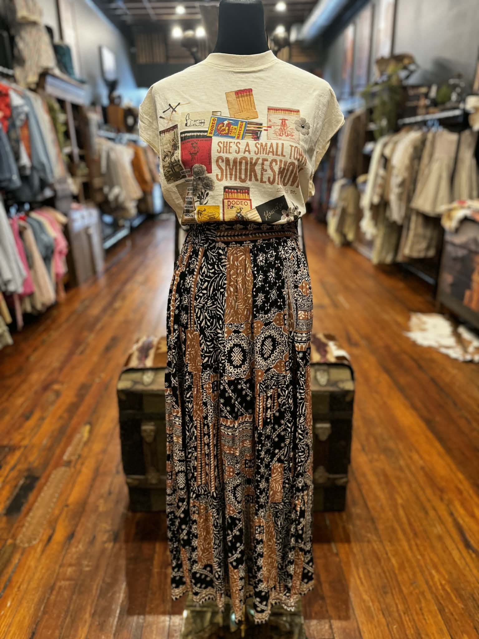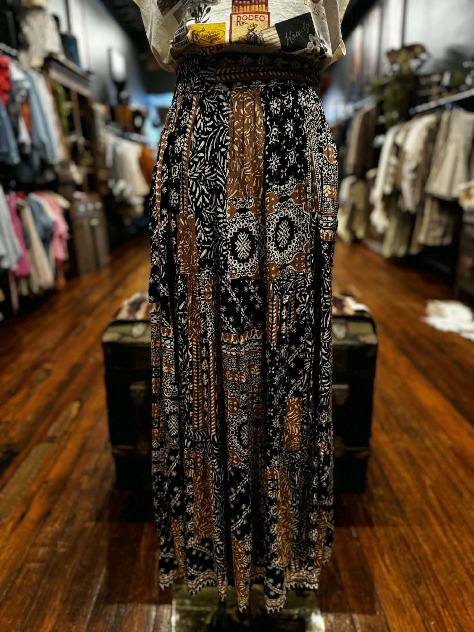 Bold, striking, and full of western edge 🖤 The Dust & Shadow – Mosaic Slit Skirt features a rich black base accented with warm orange mosaic-inspired detailing for a look that feels both artistic and desert-chic. Crafted from lightweight 100% rayon, this skirt flows effortlessly while keeping a flattering, easy silhouette.