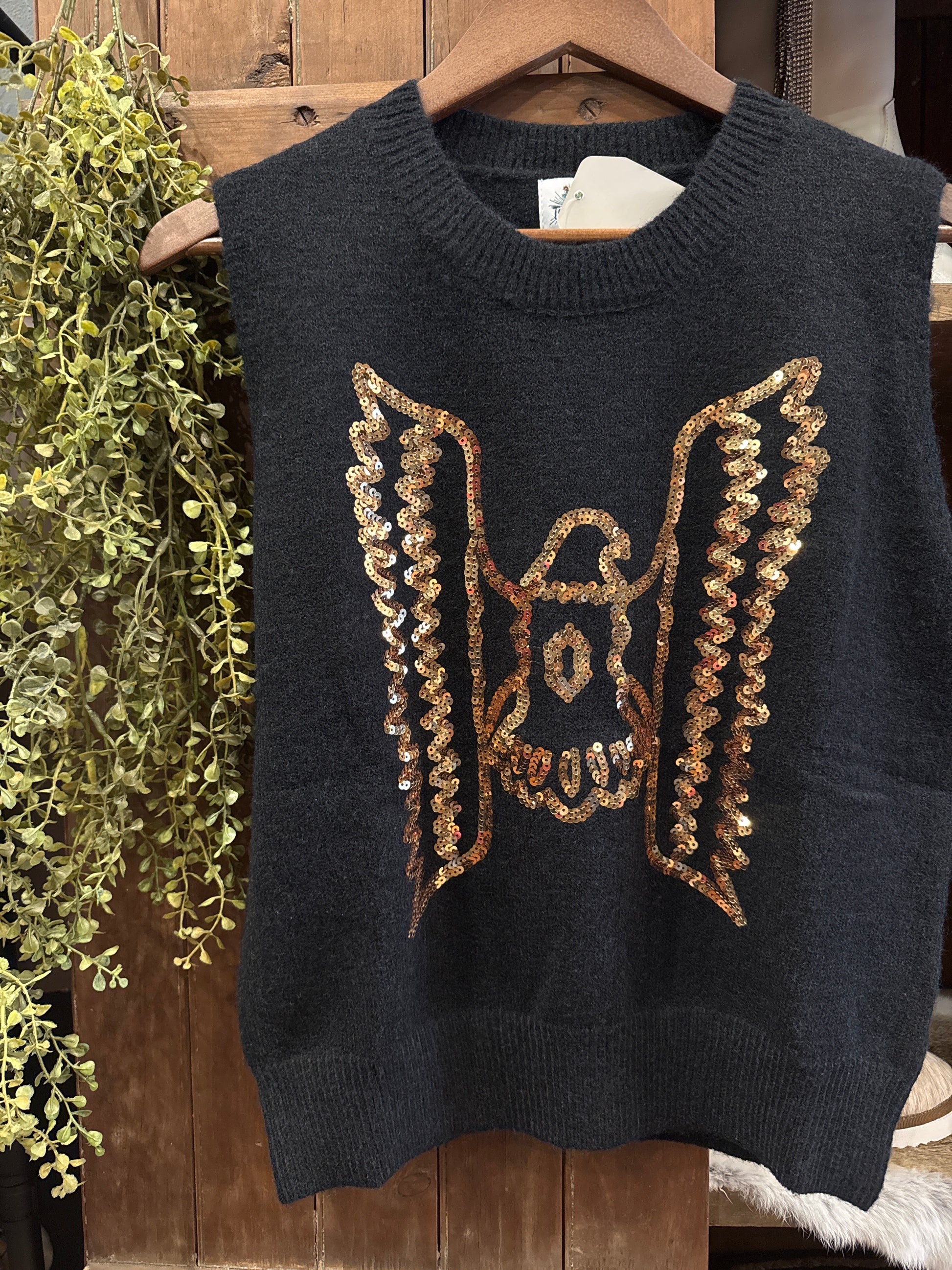 Designed with a classic sleeveless silhouette, this sweater vest is perfect for layering over tees, button-downs, or dresses. The soft knit construction offers comfortable wear, while the high-contrast black-and-gold palette makes it a standout piece for fall styling and beyond. Pair it with denim and boots for a western edge or dress it up with tailored pants for a polished look.