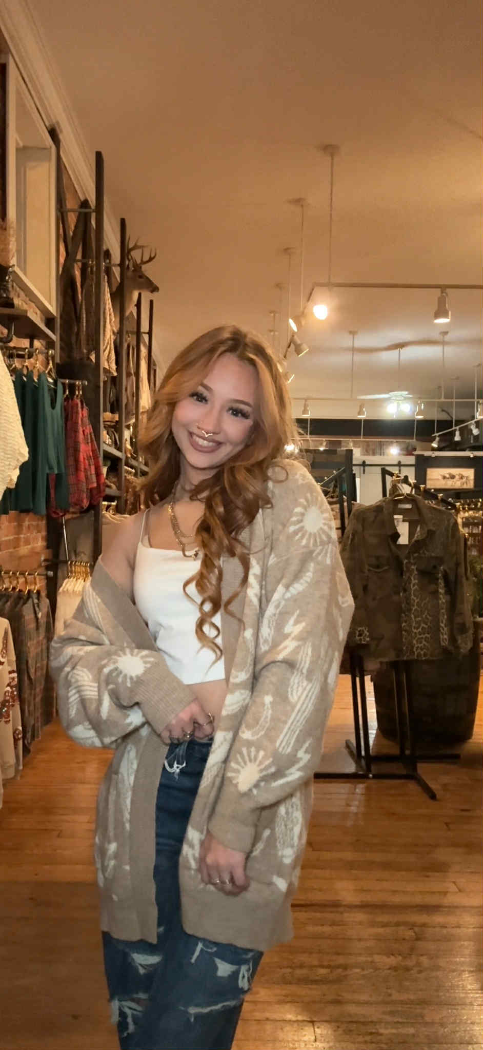 Cozy, bold, and full of western spirit — our High Desert Knit Western Cardigan is your new go-to layering piece. Crafted from a thick, soft blend for warmth and comfort, this cardigan features a light mocha base with an ivory western print throughout. The heavyweight knit drapes beautifully while keeping you snug, making it perfect for chilly mornings, nights by the fire, or a day out on the ranch.