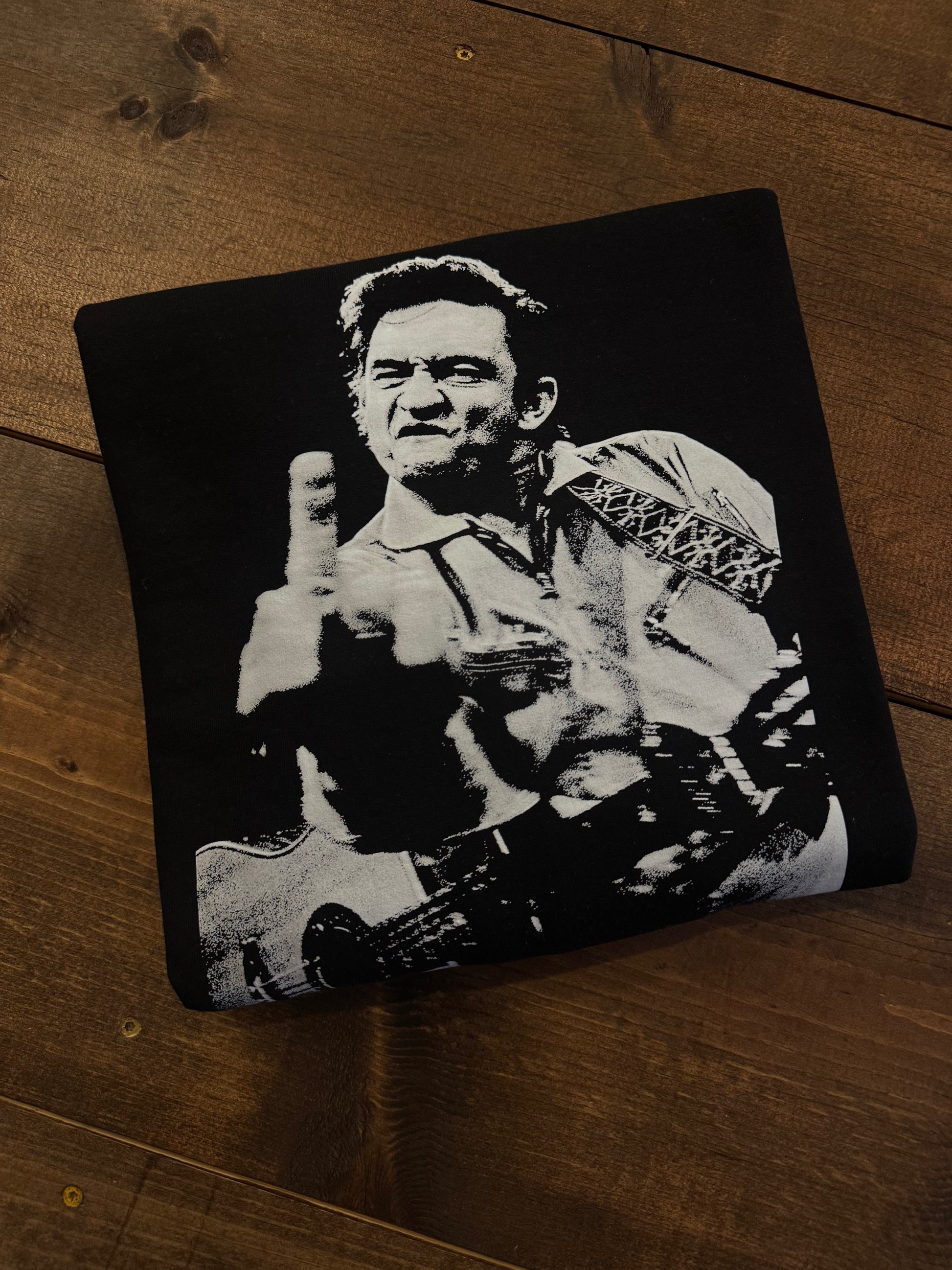 Bold, iconic, and unapologetic— the Man in Black Attitude Crewneck pays homage to legendary outlaw energy with a statement-making Johnny Cash graphic. Crafted from a soft yet durable cotton-poly blend, this crewneck delivers everyday comfort with a classic fit that never goes out of style. Effortlessly cool and endlessly wearable, it’s the perfect layer for casual days, concerts, or adding edge to your off-duty look.