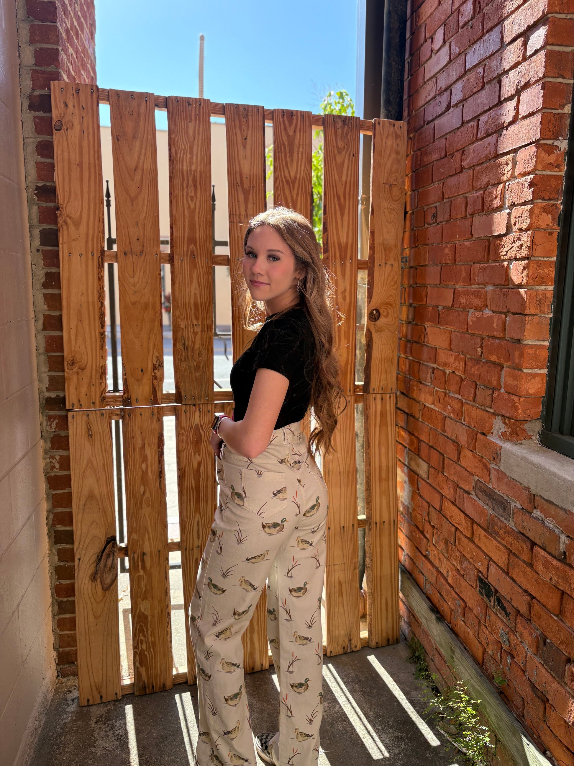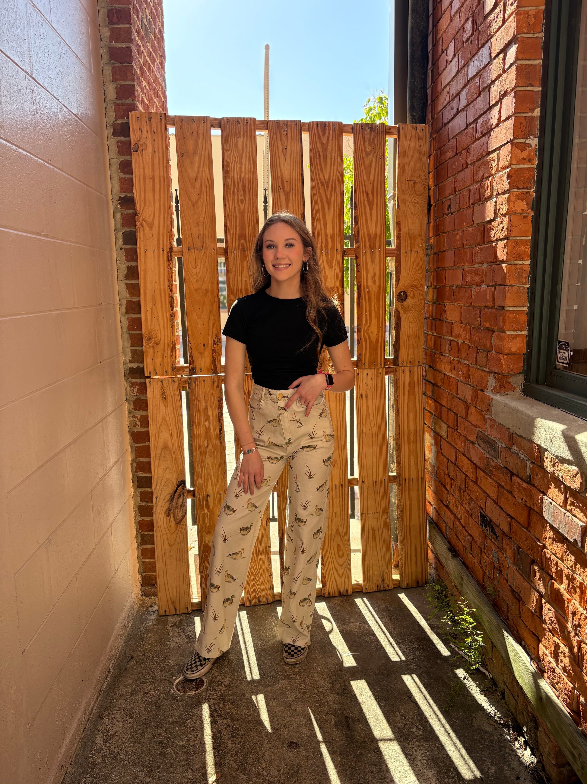 Meet your new everyday neutral. The Ranch Water Duch- High Rise Straight Jeans feature a soft sand-colored wash with a subtle duck motif that brings a playful Western touch to a classic silhouette. Made from a comfortable blend of 97% cotton and 3% spandex, these jeans offer the perfect balance of structure and stretch for all-day wear. Easy to dress up or down, they pair effortlessly with graphic tees, cozy knits, or statement jackets for a laid-back, ranch-inspired look.